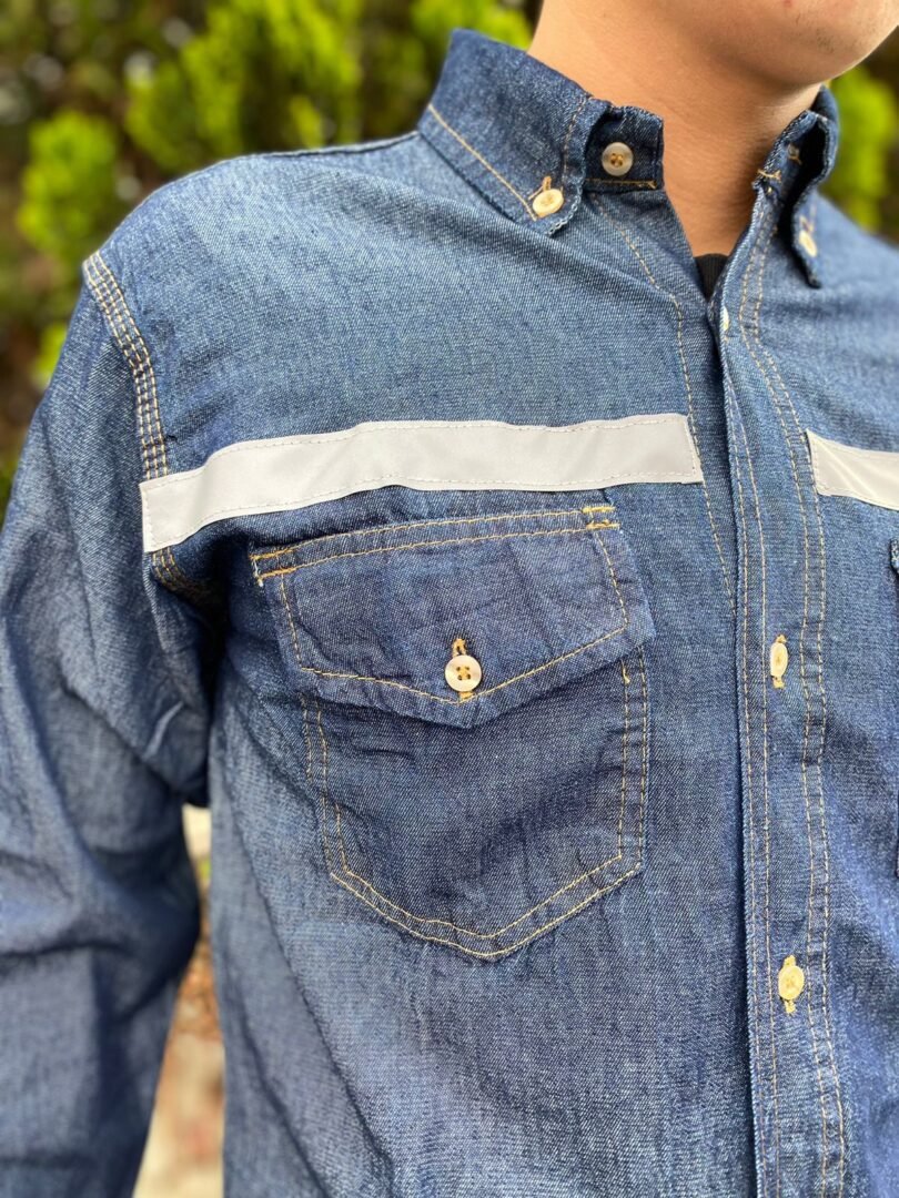 Camisa de jean para trabajo para la dotación de trabajo de un caballero con cintas reflectiva naranja de 2″ en pecho y espalda. La camisa de jean para hombre, está elaborada en tela de fácil cuidado de algodón, es apta para trabajo en cualquier clima. Tiene cuello con botones down, doble bolsillo con tapas, 7 botones de cierre delanteros, su tela es de 100% algodón. Requiere un cuidado sencillo para asegurar un uso prolongado, por sus cintas reflectivas se recomienda lavar al reves de la prenda para prolongar la vida útil del reflectivo.